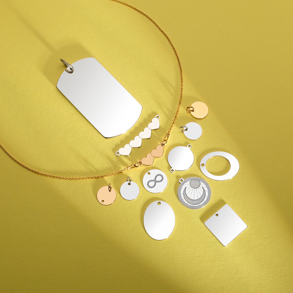 Tento typ přívěsku je velmi oblíbený mezi designéry minimalistických šperků, zejména při tvorbě módních doplňků, jako je jemný stříbrný náhrdelník či náramek typu „celebrytka“. Díky připevněnému kroužku je destička připravena k snadnému zavěšení na řetízek, šňůrku, kožený řemínek nebo jiné nosiče.