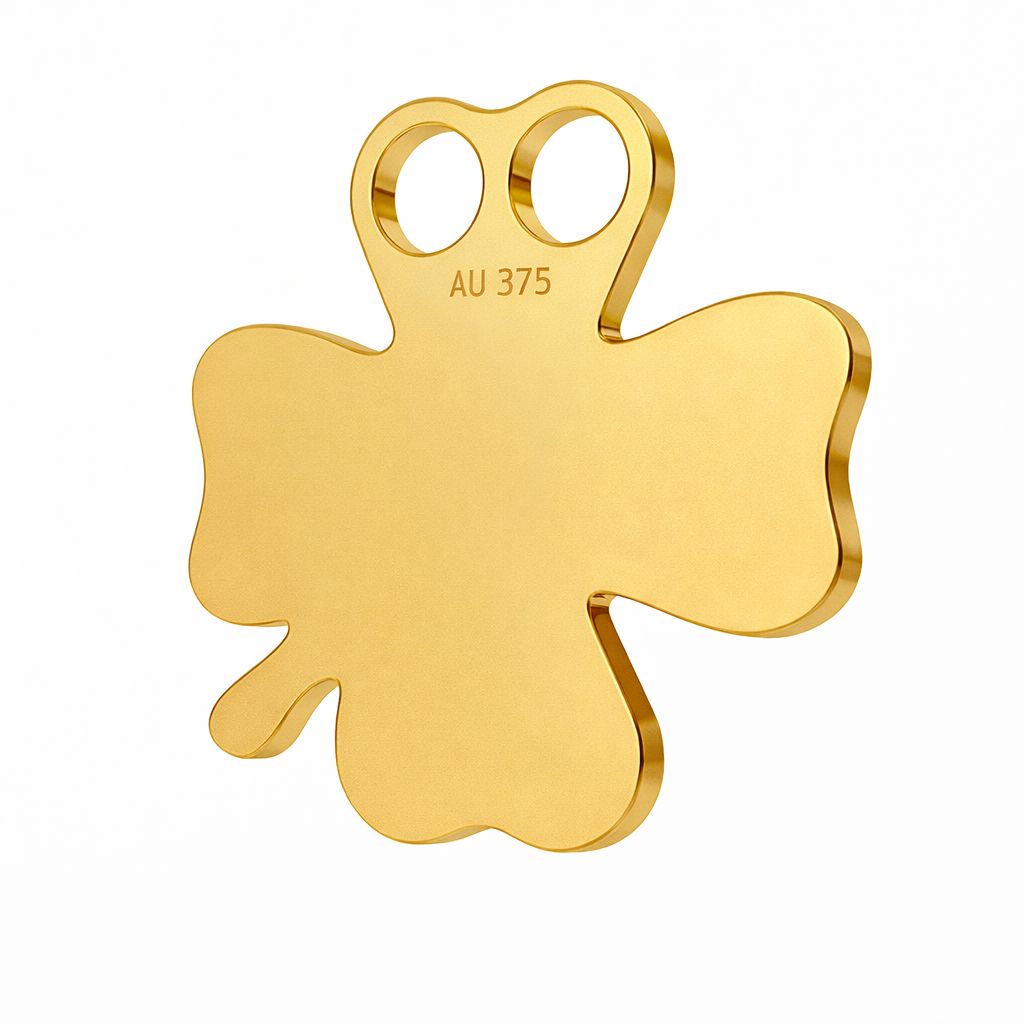 Spojovací díl s motivem čtyřlístku ze zlata AU 375 je jemný šperkařský polotovar s pozitivní symbolikou. Motiv štěstí se hodí pro personalizované a moderní projekty.
