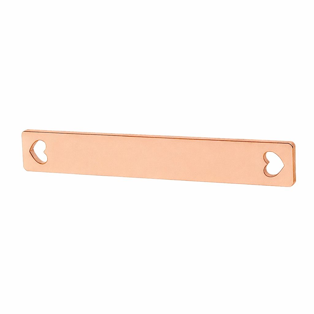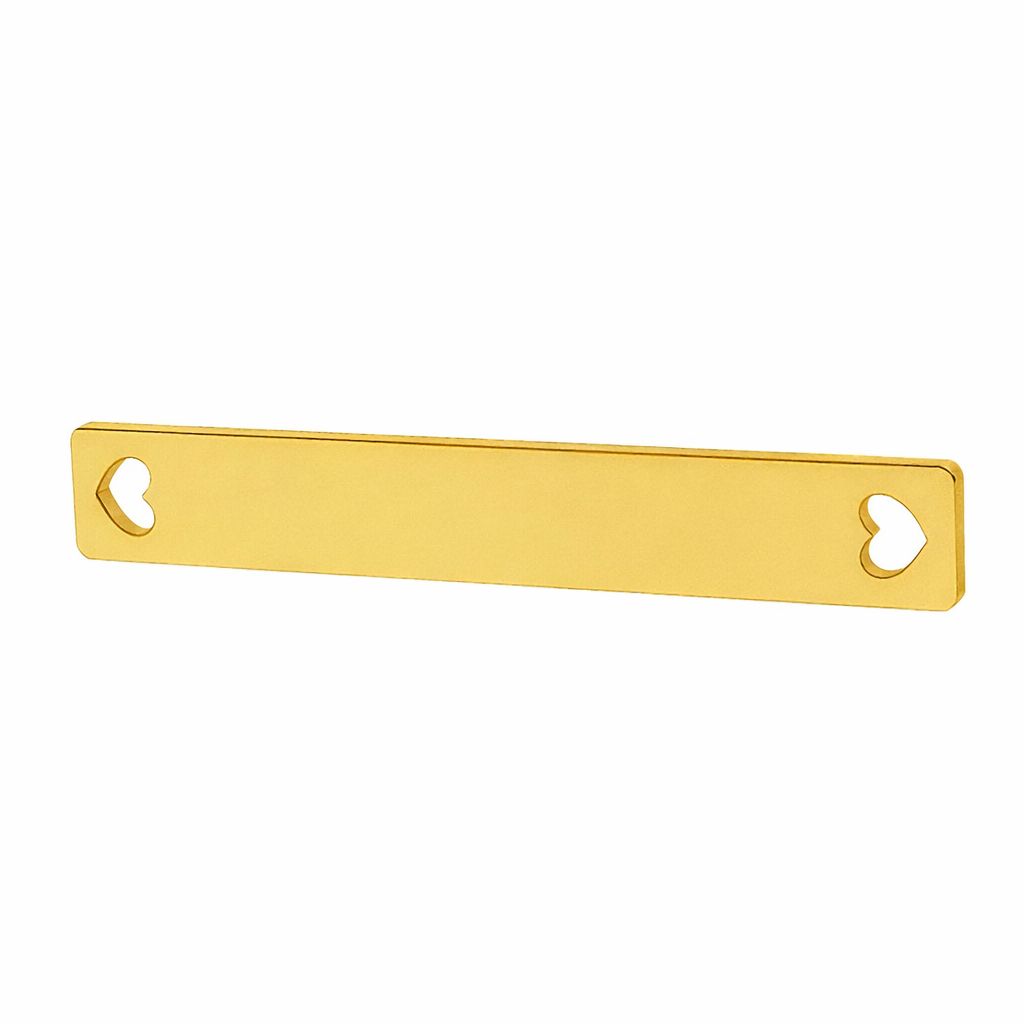 Přívěsek konektor obdélníková destička je minimalistický šperkařský prvek s podlouhlým tvarem. Vyroben z mosazi, má hladký povrch a dva montážní otvory ve tvaru srdce. Ideální pro náramky a náhrdelníky.